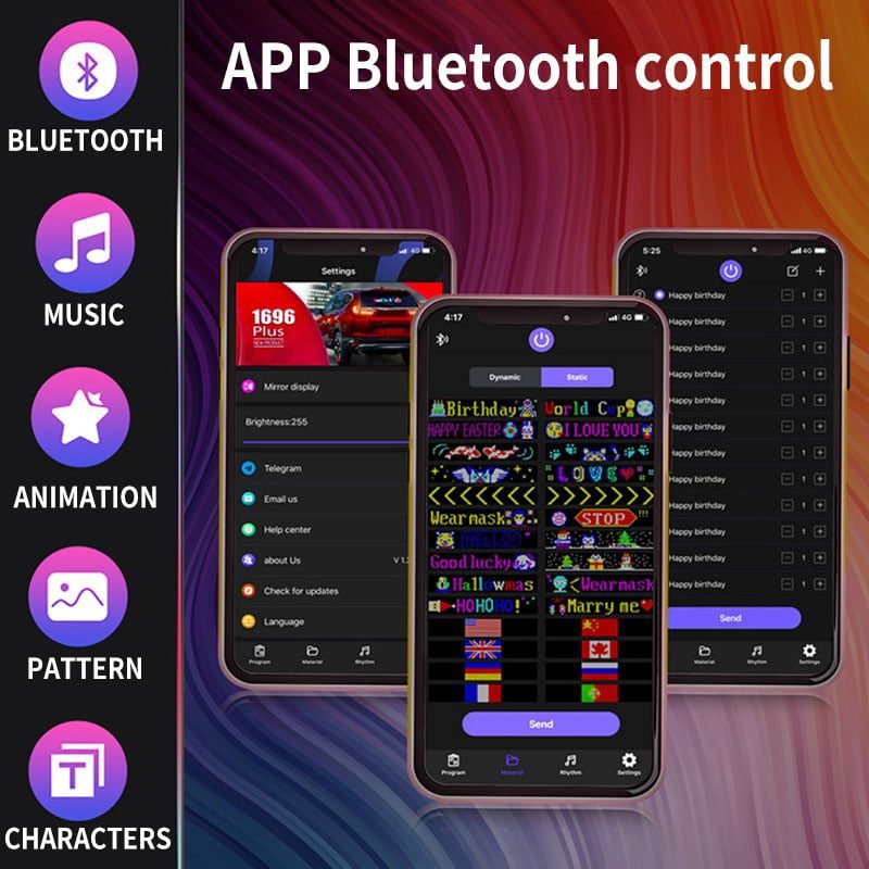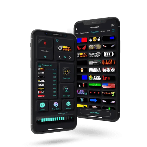 Simply plug the USB into a power source. use the app on your Apple or Android device. connect via Bluetooth. and unlock a world of features. Free-draw. free-text. upload your own images or GIFs. but here’s the kicker: Our App got an online library packed with tons of GIFs. Imagine cruising down the street with the coolest GIFs in the universe – your car’s gonna steal the spotlight like never before!