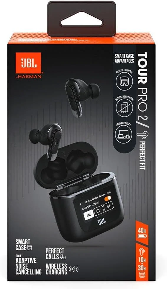 - [Smart Case for Seamless Experience] – Control the earbuds’ settings, manage calls and playback, control your audio setting and battery level and set your alarm without taking out your phone, through the screen of the charging case. Enjoy a truly seamless experience thanks to the JBL Tour Pro 2 unique smart charging case without using your phone or the JBL Headphones App.